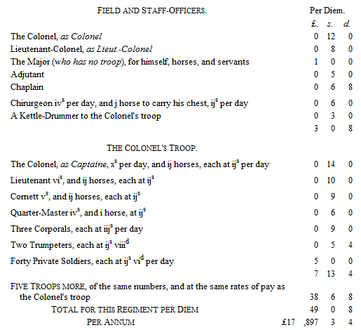 1686In these quarters the regiment passed the succeeding winter; and on the 1st of January, 1686, its establishment was fixed by a warrant under the sign manual, from which the following is an extract: —