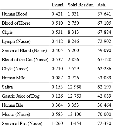Besides the important uses of the chloride of sodium in the blood to which we have already adverted, it serves the purpose of furnishing the hydrochloric acid required (by many animals, at least) for the gastric secretion; and it likewise supplies the soda-base for the alkaline phosphate, whose presence in the blood appears to serve a most important purpose in the respiratory process. Moreover, there is reason to think, from the experiments of Boussingault upon animals, as well as from other considerations, that the presence of salt in the blood and excreted fluids facilitates the deportation of excrementitious substances from the blood. The proportion in which it occurs in the principal animal fluids is represented by the following table, constructed by Lehmann chiefly from his own analyses; it is highly interesting, and shows us at a glance that it is more important in the economy than any other substance, and is significant of the fact that health cannot exist long if the chloride of sodium is below the normal amount.