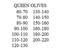The Queen olives are hand graded for size on the basis of the number per kilo. The following grades are made: