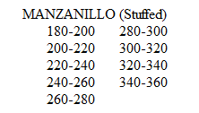 The operation of stuffing consists in removing the pit and filling the cavity with some other substance, particularly pimiento, these forming the bulk of the stuffed olive trade. The bright red of the latter gives a pleasing contrast with the green, and the mild pungency is very agreeable to many persons. Pickled celery, capers, etc., have been used, but were not so favorably received, and at present, the substances used to any extent, aside from the pimiento, are Manzanillos stuffed with pieces of Queens, and some stuffed with anchovies for the South American trade. Pitting machines have been devised, and also machines for stuffing the olives, but the work done by the stuffing machines is crude as compared with hand work. The olives used for stuffing are the Manzanillo which are smaller than the Queen. The sizes are as follows: