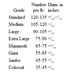 As the operators place the olives in the bottles or cans, the soft and defective ones are discarded. The containers are then filled with a 3 % brine at a temperature of 175 or 180 degrees F. The air is exhausted, during which the temperature is raised to 185 degrees, and the containers sealed, after which they are processed. The large olives in a 26 ounce glass jar are cooked for 50 minutes; extra large, 55 minutes; mammoth, 58 minutes; and colossal 60 minutes; at 240 degree F. in some factories, or for a longer period if processed at a lower temperature.