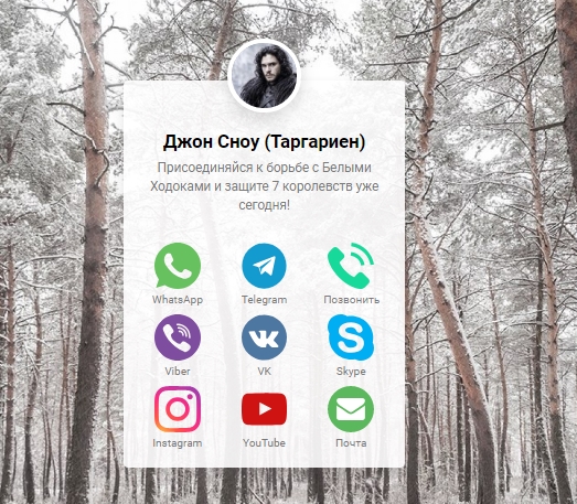 На страницу-визитку можно добавить ссылки на WhatsApp, Telegram, Viber, FB Messenger, VK, Instagram, Skype, YouTube, гугл- и яндекс-карты, а также кнопки телефона и e-mail.