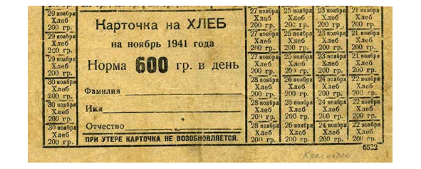 Хлеб выдавали по карточкам – кто работал 600 грамм, детям – 400 грамм, иждивенцам – 300 гр.