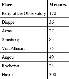 The attention of astronomers in Europe, and all over the world, was, as may be imagined, strongly roused by intelligence of this celestial display on the western continent; and as the occurrence of a meteoric shower had now been observed for three years successively, at a coincident era, it was inferred that a return of this fiery hail-storm might be expected in succeeding Novembers. Arrangements were therefore made to watch the heavens on the nights of the 12th and 13th in the following years at the principal observatories; and though no such imposing spectacle as that of 1833 has been witnessed, yet extraordinary flights of shooting stars have been observed in various places at the periodic time, tending also from a fixed point in the constellation Leo. They were seen in Europe and America on November 13th, 1834. The following results of simultaneous observation were obtained by Arago from different parts of France on the nights of November 12th and 13th, 1830: