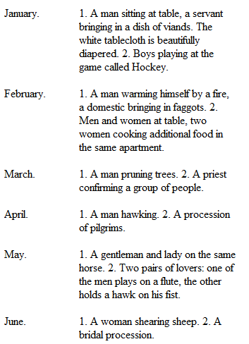 2. An exquisitely beautiful volume, in large 8vo. bound in brass and velvet. It is a Latin Horæ, elegantly written in Roman type at the beginning of the 16th century. It has a profusion of paintings, every page being decorated with a variety of subjects. These consist of stories from scripture, sports, games, trades, grotesques, &c. &c. the several employments of the months, which have also the signs of the zodiac, are worth describing, there being two sets for each month.