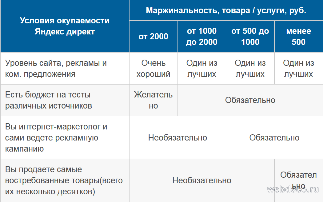1 Условия окупаемости Яндекс Директа