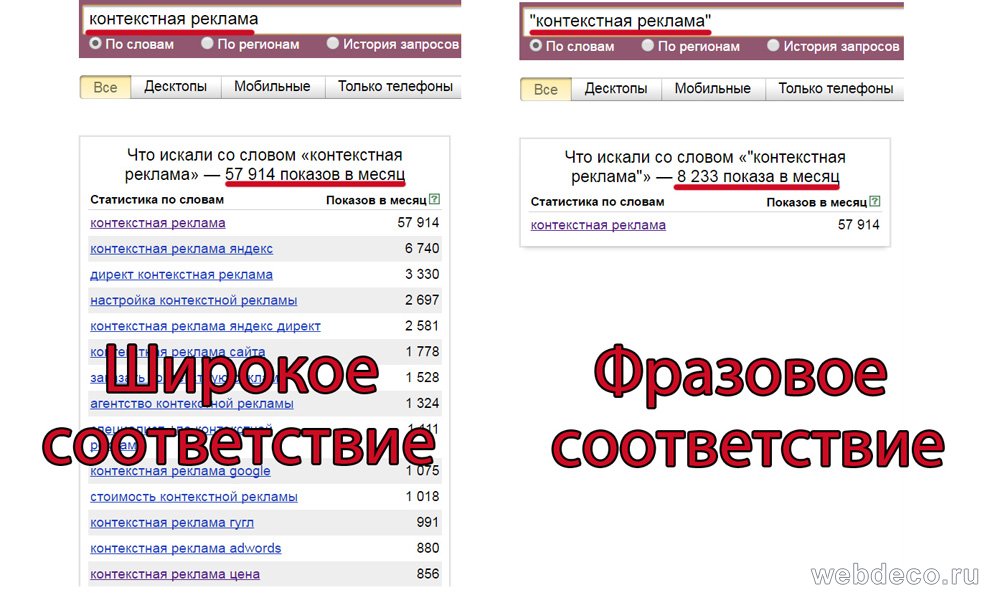Чтобы получить частотность фразы без учета дополнительных слов, введите словосочетание в кавычки, например, если ввести запрос «контекстная реклама» в кавычках, то вы получите частотность без учета дополнительных словосочетаний. Ниже приведен пример 2 запросов: Широкое соответствие и фразовое соответствие.