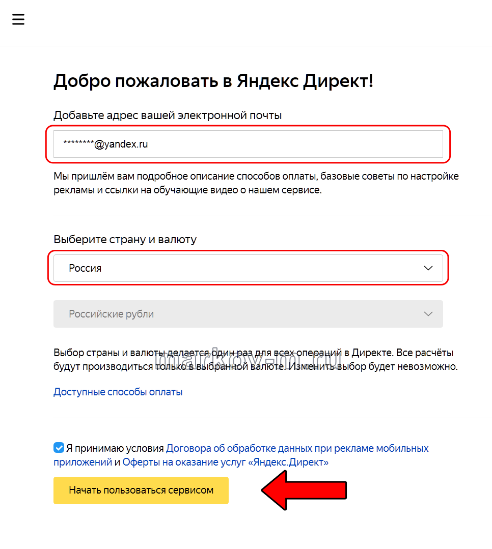 Для начала необходимо зарегистрироваться в Яндексе, чтобы получить аккаунт(почту). Переходим в direct.yandex.ru. Кликаем «запустить рекламу». Выбираем страну, эта опция нужна, чтобы определить валюту для расчета, но помните: потом этот выбор изменить будет нельзя. Вернее, можно, но для изменения этой опции нужно регистрировать новый аккаунт и заново создавать кампанию.