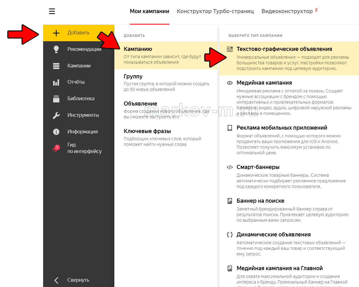 После завершения прошлого этапа мы попадаем в личный кабинет Яндекс директ (direct.yandex.ru). В левом верхнем углу жмем «+ Добавить» -> «Кампанию» -> Выбираем тип кампании (подробнее о выборе ниже).