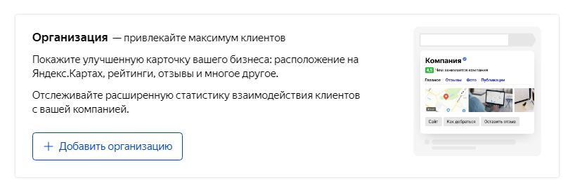 Если вы решились заполнить «организацию» вместо «виртуальной визитки», то кликайте «Добавить организацию» и выбирайте ее из Яндекс справочника(там она должна быть уже размещена). Перед добавлением убедитесь, что в Яндекс справочнике указан ваш номер телефона и сфера деятельности – это самые главные поля.