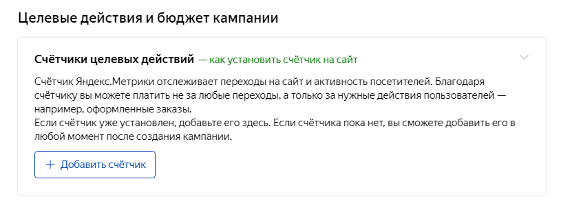 Счётчик целевых действий(Яндекс.Метрика) – бесплатный сервис оценки посещаемости сайта, обладающий большими возможностями. Если вы настраиваете Яндекс Директ самостоятельно в первый раз или не обладаете достаточным опытом, то можете пропустить пункт «Счётчики целевых действий», при желании вы сможете изменить эту опцию потом.