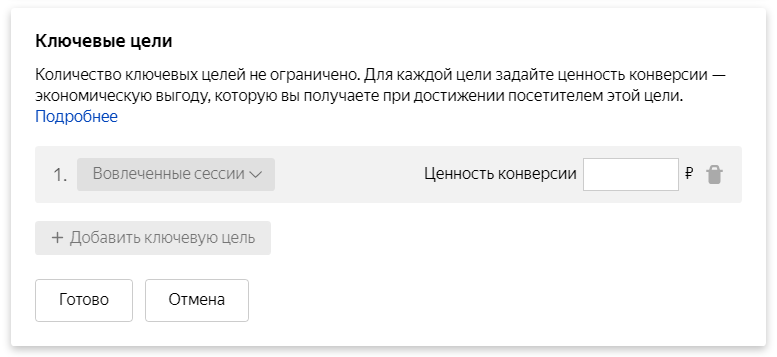 Настройка ключевых целей в Яндекс директ нужна, чтобы система автоматически корректировала ставки в зависимости от достижения целей, которые вы укажите. Но после настройки ключевых целей эффективность кампании может существенно снизиться. Вначале рекомендуется оставить это поле пустым до получения первых результатов, чтобы после активации ключевых целей было с чем сравнить и стало понятно, улучшились ли результаты или ухудшились.