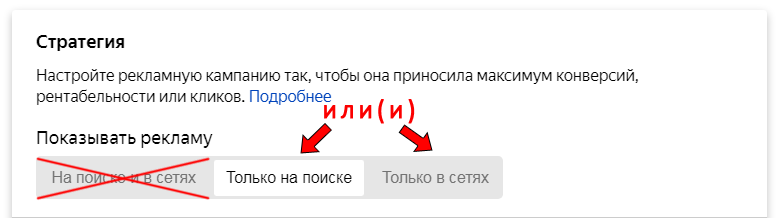 – На поиске и сетях. Никогда не выбирайте этот пункт, потому что принципы настроек в сетях и на поиске разные. Когда вы ставите одинаковые настройки, то проигрываете либо в сетях, либо на поиске или в обоих случаях, причем очень сильно. Лучше настроить Яндекс директ с 2-мя отдельными рекламными кампаниями: для поиска и для сетей.
