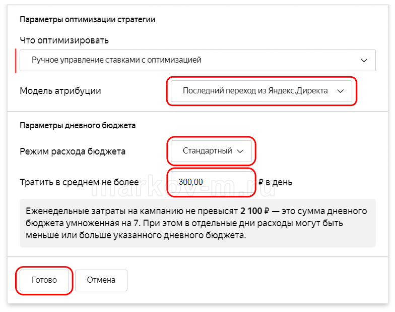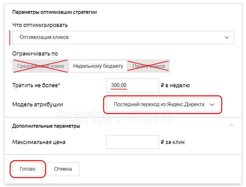 Итак, выбрав «Недельный бюджет» в графе «ограничивать по», указываем бюджет на неделю в поле «Тратить не более». Модель атрибуции ставим «Последний переход из Яндекс. Директа». Поле «максимальная цена» за клик можно заполнить только, если вы точно знаете границу, после которой клики для вас нерентабельны. В остальных случаях поле «максимальная цена» лучше оставить пустым, иначе указав низкое значение, бюджет просто не потратится и снизится число кликов . Кликаем «Готово».