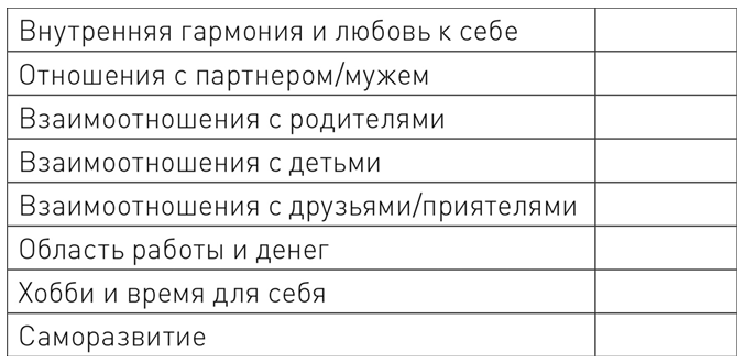 Для того чтобы начать путь к счастью, проанализируй сферы своей жизни по шкале от 1 (ужасно) до 10 (предел мечтаний). Запиши эти цифры в правый столбец таблицы.