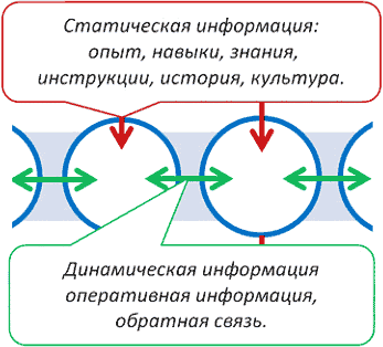 В любом процессе есть статическая информация (красные стрелки в схеме стрелки в схеме кольчуги) и динамическая (зеленые кольца – стрелки). Если быть точнее, то в первом случае идет только передача информации: от источника к приемнику. Такой вариант информационного взаимодействия будем называть «красной» информацией. Во втором случае идет именно обмен информацией, т. е. взаимодействующие объекты поочередно выполняют роль передатчика и приемника. Такой процесс обмена будем называть «зеленой» информацией.