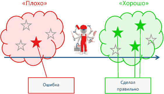 Важно, чтобы похвала была конкретной, а не общей, типа – «Это хорошо» и т. п. Т. к. конкретные параметры позволяют закрепить эту цель на будущее, а вот «хорошо» не дает конкретного направления, это «облако». Например, вместо того, чтобы сказать: