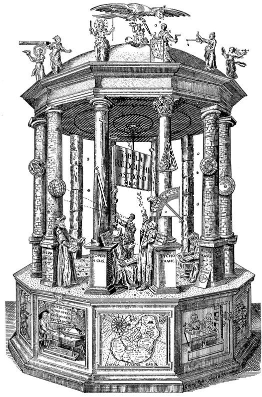 Фронтиспис к «Рудольфовым таблицам» (1627 г.) Иоганна Кеплера, символизирующий историю астрономии. На нем представлен храм Урании, где расположились Гиппарх, Коперник, Тихо Браге и Птолемей с различными инструментами. На карте (внизу по центру) изображен остров Вен, где работал Тихо Браге. Обратите внимание на телескоп Кеплера (вверху слева) и диаграмму Кеплера, на которую имперский орел изрыгает золото. Кеплер производит расчеты при свете свечи (панно слева внизу), а справа внизу работают печатники. Наследники Тихо Браге забраковали первоначальный эскиз, на котором Тихо был изображен без горностаевой мантии и королевского медальона.
