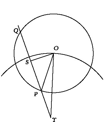Описанная конфигурация изображена на ил. 51, где точка O – центр эпицикла, а P – планета. Последняя представляется неподвижной для наблюдателя, находящегося на Земле, обозначенной здесь точкой T. Движение точки P под прямым углом к лучу зрения TQ должно складываться из двух равных и противоположно направленных компонент: одна возникает в силу того, что планете передается скорость точки O, а другая является результатом ее вращения вокруг O и направлена вдоль касательной к эпициклу в точке P. Если разложить эти скорости, то, используя простейшие методы современной геометрии, можно легко получить доказательство следующей теоремы: отношение угловой скорости в деференте к скорости в эпицикле относительно отрезка OT равно отношению PS к PT. (Здесь PS является серединой хорды QP.)