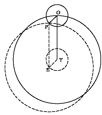 В эквивалентности этих моделей легко убедиться с помощью ил. 52, где сплошные линии обозначают эпициклическое движение, а пунктир – альтернативное представление. Забудем на время про пунктир. Для попадания в точку P из точки T нужно, очевидно, сначала переместиться в точку O, а затем – в P; или же сначала в точку E по отрезку TE, равному и параллельному отрезку OP, а затем в точку P по отрезку EP, который равен и параллелен отрезку TO. Равенство длин упомянутых здесь отрезков означает, что точки E и P лежат на кругах, изображенных пунктиром, как показано на рисунке. Точку E обычно называют эксцентрической («вне центра») точкой, а внешний пунктирный круг – эксцентрическим кругом. Сам этот круг, надо отметить, подвижен.