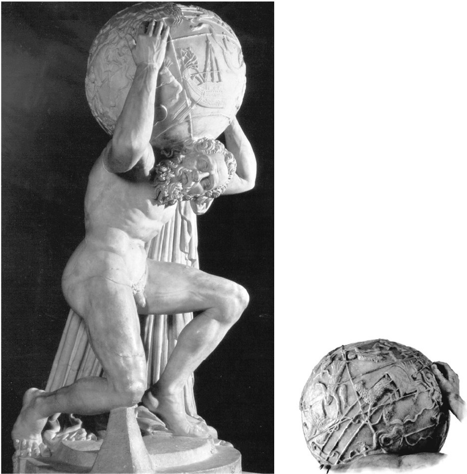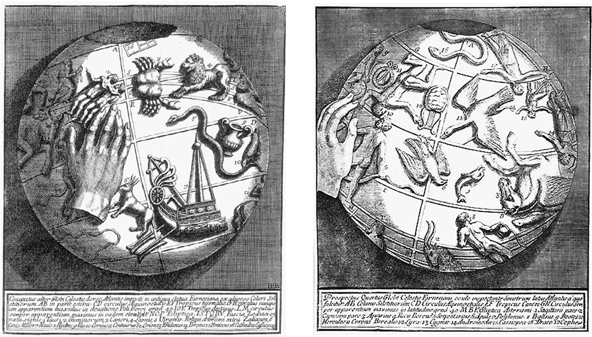 Рельефное изображение небесного глобуса Атланта Фарнезе в исполнении Джованни Баттисты Пассери (1750). Астроном Франческо Бьянкини произвел тщательное исследование этого глобуса в 1690‐х гг. В греческой мифологии Атлант был осужден Зевсом на то, чтобы вечно держать небо на своих плечах или «подпирать колонны Вселенной». Эта мраморная скульптура получила свое название в начале XVI в., после того как ее приобрел кардинал Алессандро Фарнезе. Впоследствии он выставил ее во дворце Фарнезе в Риме (в настоящее время – Национальный археологический музей в Неаполе). Как полагают историки искусства, эта статуя является римской копией, сделанной во II в. н. э. с греческого оригинала, датируемого, вероятно, II в. до н. э. Знаменитый глобус (около 65 сантиметров в диаметре) представляет собой наиболее раннее из всех известных на настоящий момент изображений подобного типа. Не следует сразу же отвергать идею о высокой точности копирования, и вместе с тем мы не можем быть абсолютно уверены в том, что эта копия верна. На глобусе отмечены зодиак, экватор, а также северный и южный полярные круги. Последняя пара кругов позволяет нам узнать, какие области звездного неба можно было наблюдать постоянно, а какие вовсе не видны с места изготовления глобуса, и таким образом определиться с широтой. К сожалению, нельзя исключать информацию о диапазоне наблюдений, полученную из косвенных источников. Время изготовления, в принципе, может быть определено по положению точек равноденствия (пересечениям эклиптики и экватора) относительно звезд – точек, которые смещаются со временем в результате прецессии. К сожалению, исходя из изображения созвездий, можно дать только грубую оценку предполагаемого положения звезд. Северные полярные области повреждены, поэтому созвездия Малая Медведица и Большая Медведица отсутствуют, но сорок два других созвездия – в полной исправности. Как это обычно и делается на глобусе, созвездия изображены не так, как они наблюдаются с Земли, а как будто бы на них смотрят «снаружи», это вполне логично. Представляется вполне вероятным, что оригинал глобуса предшествовал каталогу Гиппарха и был изготовлен на широте Самоса, Афин, западной оконечности Апеннинского полуострова или Северной Сицилии с погрешностью в один градус или около того.