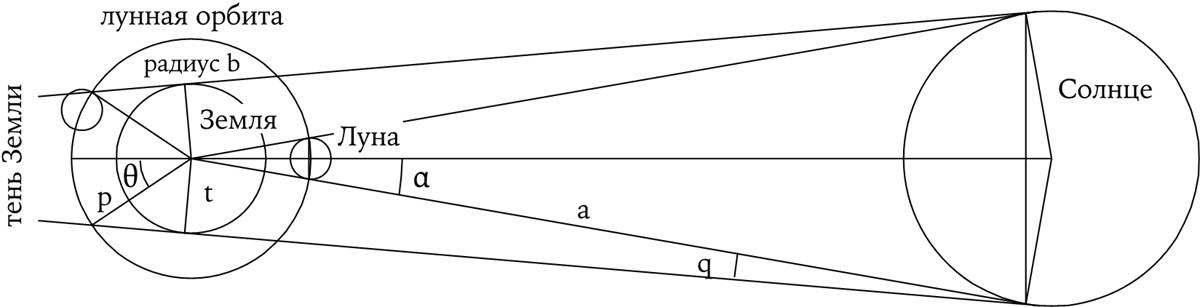 Диаграмма Аристарха для абсолютных взаимных расстояний (или размеров) Солнца и Луны. (Для наглядности пропорции диаграммы сильно завышены.) Он считал установленными относительные расстояния, найденные ранее, и полагал, что нам известны угловые размеры тени Земли на лунном расстоянии (которые, в принципе, можно определить по временному интервалу между моментами вхождения Луны в земную тень и выхода из нее). Его пространное доказательство является демонстрацией применения скорее геометрических методов, чем истинных эмпирических параметров. Тригонометрические аргументы, используемые в нашем кратком изложении, только отдаленно воспроизводят применяемые им технические приемы. Рассмотрим углы, обозначенные на схеме α и θ, и два угла между ними, дополняющие их до прямых углов. Та же пара необозначенных углов вместе с углами p и q составляет два прямых угла, из чего следует, что (α + θ) равно (p + q). Угол α легко измерить (хотя Аристарх в своем трактате присваивает ему абсурдное значение 1°), а угол θ он полагает равным 2°, что в сумме дает 3°. Ранее он уже приводил аргументы, касающиеся отношения расстояний до Солнца и Луны («больше, чем 18, но меньше, чем 20»). Если применить часто используемое приближение, согласно которому малые углы пропорциональны их синусам (или тангенсам), то предыдущее высказывание будет равносильно утверждению, что значение p заключено между 18q и 20q, то есть 3° лежат между 19q и 21q. Примем в качестве средних значений (чтобы сократить рассуждение) q = 3°/20 и p = 57°/20. Тогда, если измерение ведется в земных радиусах, расстояние до Солнца (a) будет равно величине, обратной sin 0,15° (то есть около 382), а расстояние до Луны (b) – величине, обратной sin 2,85° (около 20,1). На самом деле, Аристарх не приводит итогового результата. Отсюда, следуя простым геометрическим операциям, можно получить размеры Солнца и Луны (в единицах радиуса Земли).