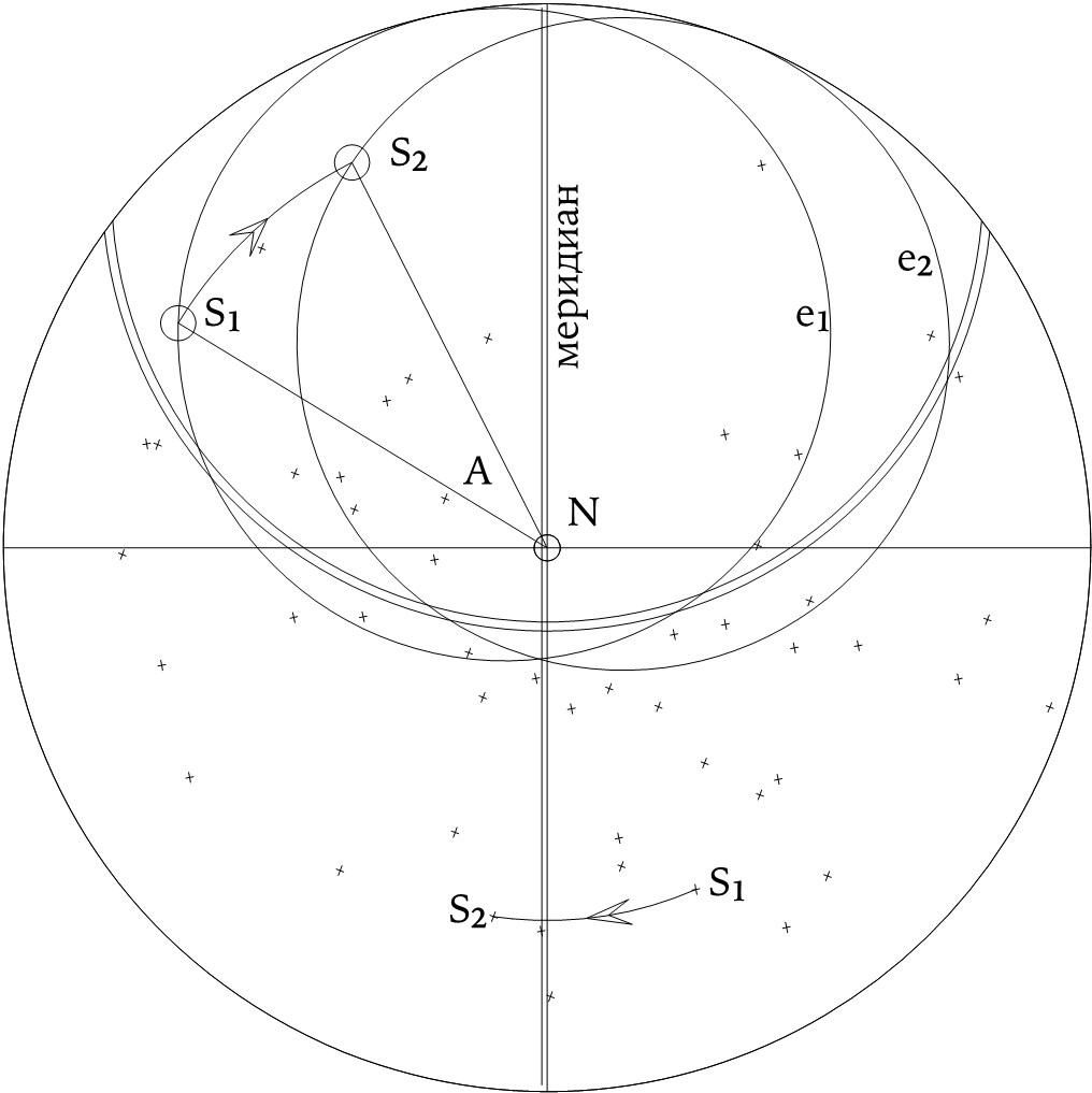 Эта диаграмма иллюстрирует общий принцип действия плоской астролябии. S 1 и S 2 – два положения Солнца при его движении вокруг полюсов (один из них обозначен на диаграмме центральной точкой N). Представлены также соответствующие положения эклиптики – линии годового движения Солнца (e 1 и e 2 ) – и звезд. Помечено перемещение только одной звезды. Можно было бы показать и более широкий круг звезд, включая расположенные вблизи Северного полюса мира, но обычно звездная карта изготавливалась таким образом, чтобы охватить только эклиптику, поскольку для наблюдателей, находящихся в Северном полушарии, эта зона включала большинство наиболее ярких звезд. Изображенное движение, соответствующее смещению на угол A, отражает изменения, произошедшие примерно за два часа. Меридиан и местный горизонт, обозначенные на диаграмме двойными линиями, не участвуют в движении Солнца и звезд. Солнце, очевидно, приходит в точку S 1 спустя примерно полчаса после восхода. Расположение круговой дуги, отображающей горизонт, зависело от географической широты, для которой изготавливалась астролябия. Чтобы получить более подробное представление об этом инструменте, см. ил. 65–68.