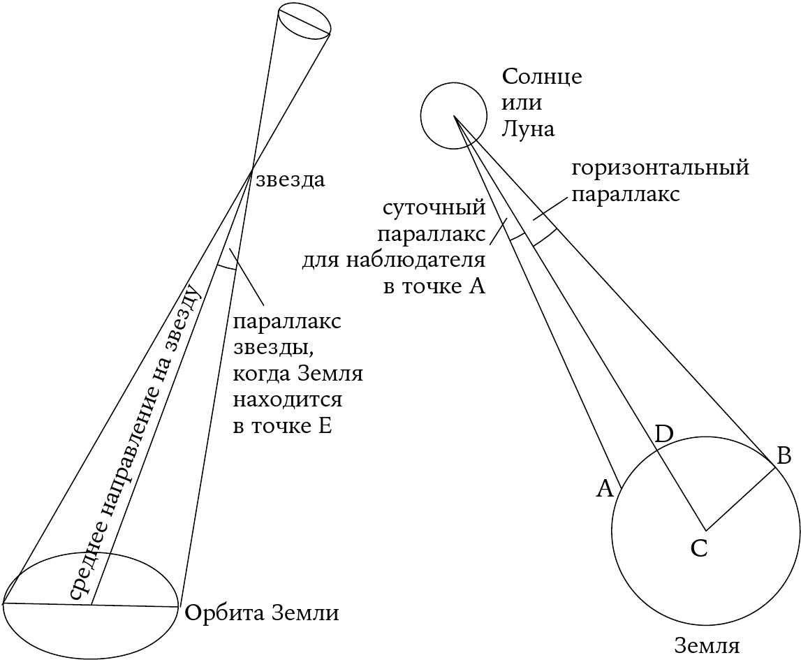 В общем случае «параллаксом» называют угол изменения видимого положения объекта при рассматривании его из двух различных пунктов. Забегая вперед, отметим, что, поскольку Земля движется по своей орбите вокруг Солнца, угол отклонения какой-либо близко расположенной звезды будет меняться таким образом, что она постепенно опишет на небе крошечный эллипс на фоне удаленных звезд (см. левую часть рисунка). Полный эллипс будет описан за год. Этот звездный параллакс (или «годичный параллакс») необходимо отличать от суточного параллакса, столь важного для внесения поправок в предвычисленные солнечные и лунные положения. Будучи рассчитанными на основе планетных моделей, они часто соотносятся с центром Земли. Однако наши наблюдения за Солнцем и Луной осуществляются из точки, отстоящей от центра Земли более чем на 6350 километров. Если мы наблюдаем какой-либо объект, когда он находится точно над нашей головой, то параллакс равен нулю, поскольку мы сами (в точке D на правой части рисунка), центр Земли и наблюдаемый объект располагаются на одной линии. Очевидно, что параллакс возрастает до максимума, когда объект находится вблизи горизонта, а мы – в точке B, как это показано на рисунке. Когда мы говорим о солнечном или лунном параллаксе в широком смысле, мы имеем в виду эти максимальные значения. Они, очевидно, напрямую связаны с расстояниями до рассматриваемых тел и с радиусом Земли, и начиная с XVIII в. было принято приводить их точные значения в расчете относительно экваториального радиуса. Так это слово вошло в устойчивый терминологический оборот: «средний экваториальный горизонтальный параллакс».