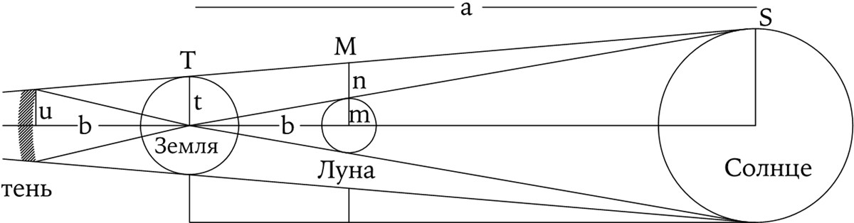 Пытаясь определить расстояния до Солнца (a) и Луны (b) в радиусах Земли (t), Гиппарх следовал примеру Аристарха (ил. 50). Он достаточно точно определил значения их видимых угловых размеров (полагая их равенство друг другу). Он считал, что угловые размеры земной тени на лунном расстоянии в 2½ раза превосходят размеры Луны. Однако этого было недостаточно: по его оценкам, солнечный параллакс должен быть равен 7 минутам дуги, что эквивалентно расстоянию в 490 земных радиусов. (О понятии параллакса см. с. 157.) Версия его собственного доказательства утрачена, однако ее можно восстановить по описаниям, оставленным Птолемеем. Как и у Аристарха, она, по-видимому, была избыточно геометричной и рассудочной, но Гиппарх, очевидно, обладал бо́льшим опытом в использовании приближений, точнее согласующихся с малыми углами в численном отношении. Они приведены здесь без дополнительных пояснений. Расстояние, обозначенное на рисунке буквой n, не играет большой роли и будет впоследствии исключено. Поскольку Земля находится между Луной и собственной тенью, ее радиус t определится как среднее арифметическое значений u и (n + m). Отрезки, обозначенные как n и t, являются основаниями подобных треугольников, а значение (n ÷ t) равно отношению (SM/ST). Последнее отношение, в свою очередь, равно (a – b) ÷ a, поскольку отрезки, обозначенные этими буквами, также являются соответствующими сторонами подобных треугольников. (Для большей очевидности и во избежание путаницы эти треугольники изображены в нижней части рисунка.) Теперь в нашем распоряжении есть все необходимое – два уравнения, из которых можно исключить n: