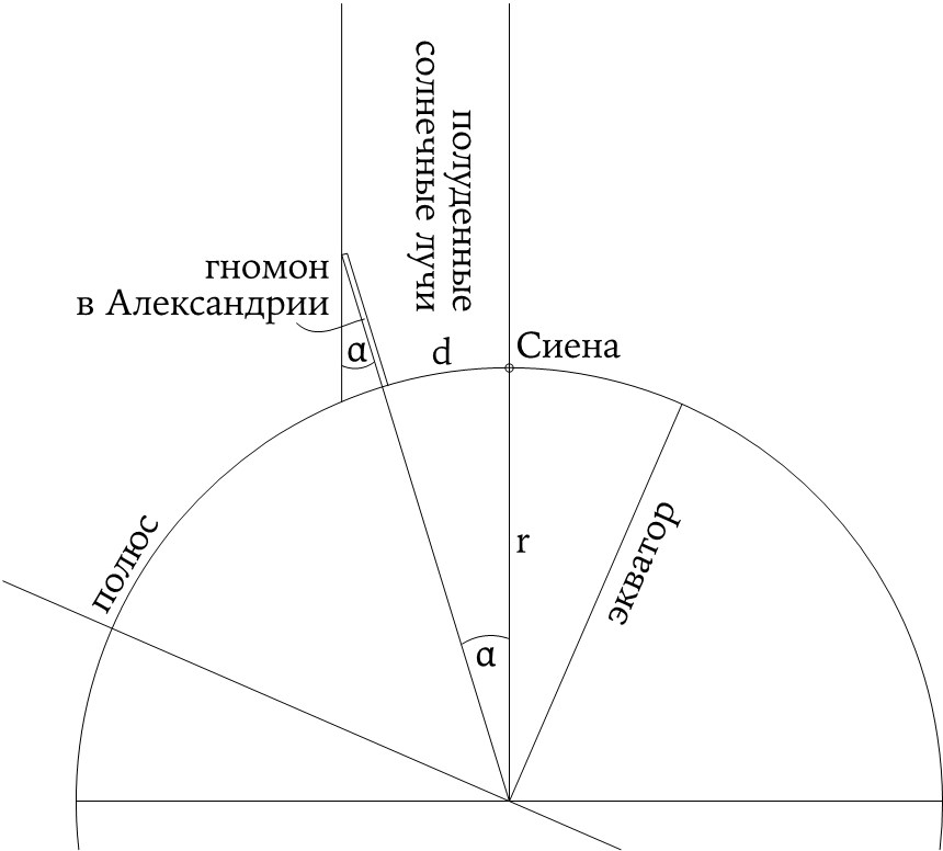 Согласно общему мнению, Эратосфен руководствовался сведениями о расположении полуденного Солнце в Сиене в день летнего солнцестояния прямо над головой, так что гномон не отбрасывает тени, а отблески солнечных лучей можно увидеть со дна самого глубокого колодца. Он измерил угловое зенитное расстояние Солнца (α) в Александрии, находящейся от Сиены на расстоянии (d), которое считалось равным 5000 стадий. Определив, что α составляет 1/50 часть окружности, он пришел к выводу: длина окружности Земли равна 250 000 стадий. Греческий стадий всегда считался равным 600 футам, но фут относится к слабо стандартизированным единицам. Оценивая результат Эратосфена в 48 000 километров, получаем значение, завышенное примерно на одну пятую часть. По-видимому, сам Эратосфен не был в нем уверен и пытался оценить его другими способами. Свидетельства моряков о том, что, на самом деле, расстояние до Сиены на одну пятую часть меньше принятого им за исходное, привели его к исправленному значению в 180 000 стадий.