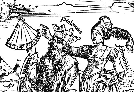 Распространенное заблуждение: Птолемей в обличье царя. Фрагмент ксилографии Грегора Рейша из книги «Margarita Philosophica» (1503). Персонифицированная Астрономия объясняет астроному, как пользоваться квадрантом.