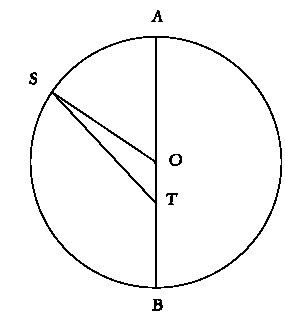 Птолемей прилагает таблицы, позволяющие быстро вычислять два угла, необходимые для нахождения положения Солнца. Использованные им методы были впоследствии распространены на более сложное движение планет и предвосхитили появление идеи создания общей теории небесного движения. Для Солнца требуется знать два исходных параметра, а третий мы введем чуть позже. В простейшей эксцентрической модели (не будем забывать, что она эквивалентна эпициклической) этими параметрами являются: 1) среднее движение Солнца по кругу деферента, то есть вокруг его центра; и 2) эксцентриситет OT в долях отрезка OS, как показано на ил. 60. Нам необходимо получить угол ATS. Здесь O – центр деферента, а T – место наблюдателя на поверхности Земли, а ее размерами, как предполагается, можно пренебречь. Угол ATS получается как разность среднего движения (угол AOS) и угла OST. Угол AOS (среднее движение), очевидно, можно представить в виде табличной величины, зависящей от времени, измеряемого, например, в сутках или часах, или одновременно и в часах, и в сутках, поскольку оно течет равномерно. С помощью тригонометрических преобразований угол OST может быть довольно легко представлен в виде функции, зависящей от среднего движения и эксцентриситета. (Птолемей называл этот угол простафарезис – «угол, который должен быть прибавлен, либо вычтен»; мы же будем называть его уравнением или аномалией. Смысл заключается в том, что он позволяет внести поправку для среднего положения и получить из него истинное, где под «истинным» понимается видимое нами на самом деле.) Таким образом, Птолемей составил таблицу, позволяющую совершить быстрый переход к истинному положению, исходя из среднего движения, которое, в свою очередь, определялось из первой таблицы.