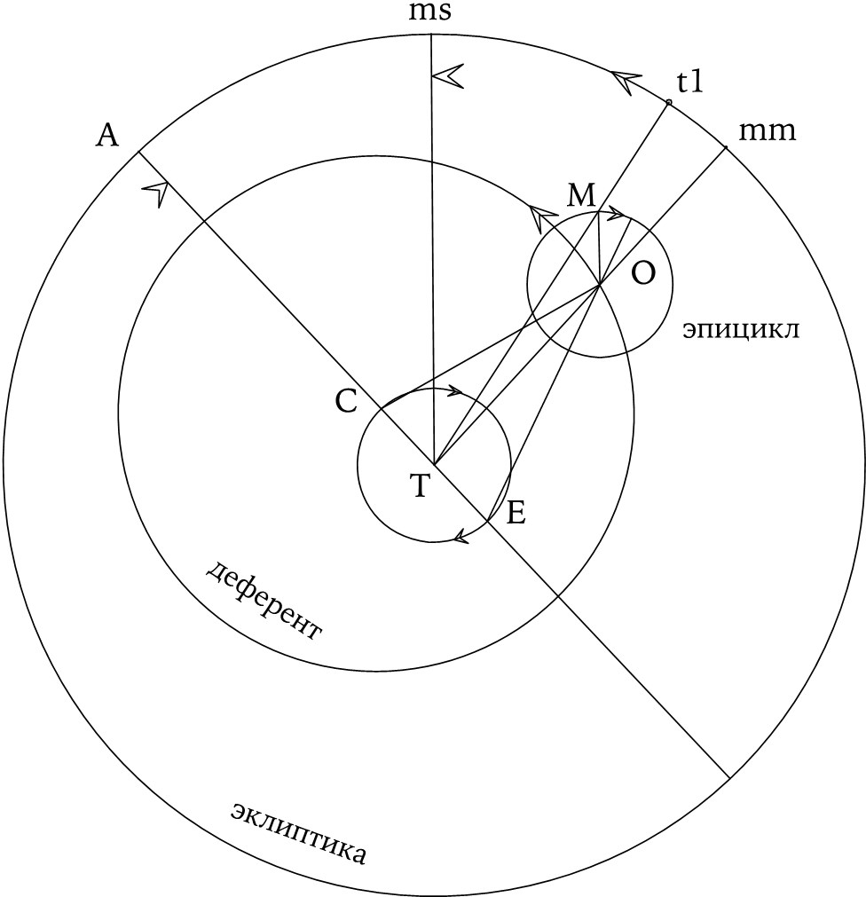 Лунная модель Птолемея. Точка T обозначает Землю, C – (подвижный) центр круга деферента, M – Луну, а E – точку «экванта», вокруг которой центр эпицикла (O) движется с постоянной угловой скоростью. Следует обратить внимание на нетипичное направление кругового вращения Луны в эпицикле. Эпициклам всех планет свойственно «прямое» движение, то есть вращение в противоположном направлении. Среднее эклиптическое положение Луны задается направлением mm, а окончательная истинная долгота – направлением tl.