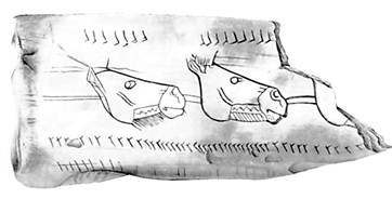 Верхнепалеолитическая резьба по кости (период Мадлен, ок. 9000–15 000 лет до н. э.) из Ле-Мас-д’Азиля (Франция). Северные олени, дикие лошади (изображенные на приведенном рисунке) и бизоны – не редкость на подобного рода изображениях; однако на образцах часто встречаются ряды больших и малых отметин – предположительно, точно посчитанных. Они обнаруживаются по всей Европе и далеко за ее пределами – в России и даже в некоторых регионах Африки – и датируются примерно одним и тем же периодом. Костяные пластины подобного рода интерпретируют как охотничьи подсчеты, но Александр Маршак утверждает, что они служили для счета дней, распределенных по месяцам. Обнаженная фигура палеолитической Венеры из Лосселя (находящегося в том же регионе Франции) держит в поднятой руке рог с примерно таким же числом бороздок. Она не была охотницей, и это подкрепляет догадку о существовании связи между отметинами на роге и менструальным циклом.