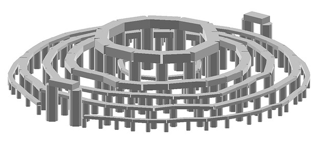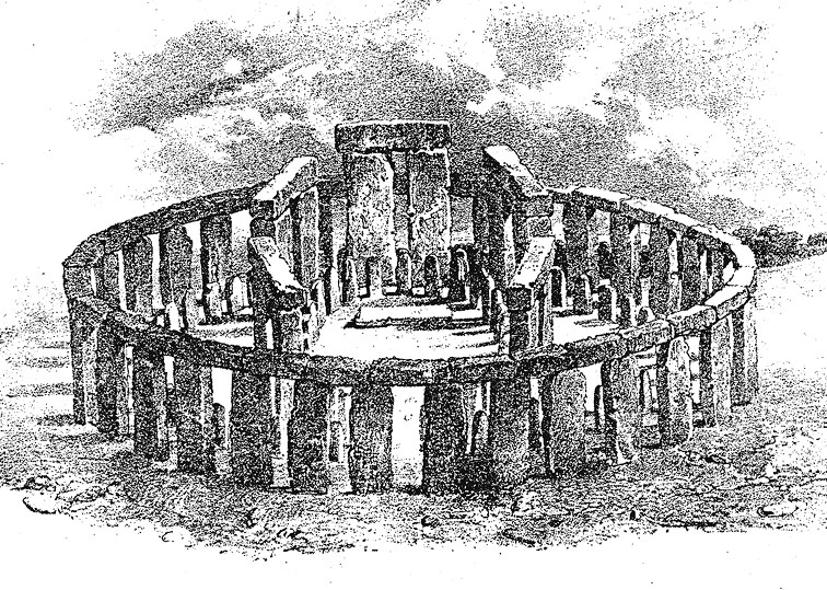 Приблизительная реконструкция общего вида наиболее крупных элементов памятника Стоунхенджа, как они выглядели к концу третьего тысячелетия до н. э. (по Э. Х. Стоуну, 1924)