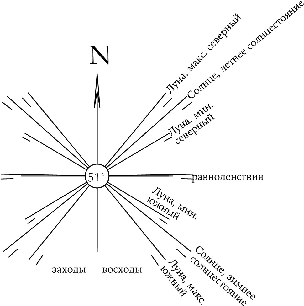 Крайние положения восходов и заходов Солнца и Луны на географической широте 51° (Северная Британия) для эпохи 2000 лет до н. э. По понятным соображениям, экстремумы солнечных положений не меняются в течение долгих периодов времени, но крайние положения Луны флуктуируют между верхним и нижним пределами, как показано на рисунке. Направления зависят от нашего понимания восходов и заходов. В данном случае предполагается, что наблюдались моменты, когда верхний край солнечного или лунного диска появлялся на горизонте, и моменты, когда исчезал последний луч того или другого светила. Помимо этого, направления зависят от высоты местного горизонта, которая не может быть определена с достаточной точностью. На рисунке высота горизонта принята равной нулю. Но даже в этом случае линия равноденствий не в точности совпадает с направлением «восток-запад».