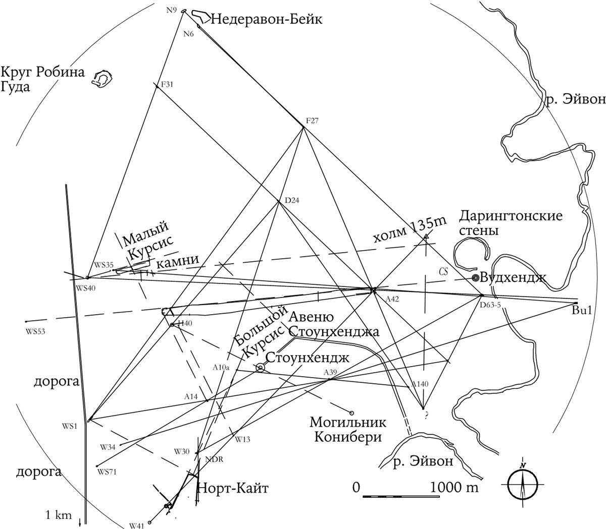 Расположение продолговатых могильных холмов на равнине Солсбери в окрестностях Стоунхенджа на территории порядка семи километров в ширину. Можно не принимать во внимание стандартные обозначения захоронений (N9, N6 и т. д.), поскольку они даны по названию церковных приходов. Рисунок обнаруживает замечательную особенность могильных холмов: почти все они распределены по трем или четырем направлениям, и каждое из этих направлений указывает на восходы или заходы нескольких очень ярких звезд. То же самое справедливо для захоронений в соседних регионах, хотя избранные звезды часто различались, поскольку им приписывался тотемный характер. Обратите внимание на очевидную параллельность направлений, особенно в северной области. Она не могла быть достигнута средствами наземных измерений из‐за больших пространств, покрытых лесами и другими препятствиями между могильными холмами. При выравнивании двух тройных захоронений по ярким звездам параллельность достигалась автоматически. Заметьте, что не менее пяти направлений проходят через захоронение (A42), расположенное в самом конце Большого рва Стоунхенджа. Сейчас оно полностью разрушено, но его особая важность в те далекие времена не вызывает сомнений, поскольку звездным направлениям придавалась высокая значимость.