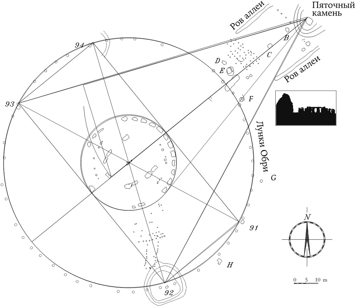 Геометрический план Стоунхенджа, построенный по нанесенным на карту сохранившимся камням. Ключ к пониманию памятника содержится в Пяточном камне. Если смотреть вдоль луча зрения, проходящего через Пяточный камень и центр памятника, то можно увидеть лучи заходящего Солнца в разгар зимы, освещающего силуэты других конструкций памятника со стороны центра. Как деревянные, так и каменные кольцевые памятники обладали каркасной структурой, легко пропускающей лучи любого направления, однако обычно существовало лишь несколько точек наблюдения, с которых эти памятники выглядели как величественные сооружения. Пяточный камень являлся как раз такой точкой. Рисунок на врезке отображает современный вид силуэта памятника, наблюдаемого с Пяточного камня, однако он не передает полного впечатления, поскольку многие столбы утрачены. Периферийное кольцо помечает положение так называемых лунок Обри (названных по имени их первооткрывателя Джона Обри), как-то связанных с первой фазой строительства памятника (ок. 3000 лет до н. э.). Четыре малых камня на периферийном кольце (так называемые «опорные камни»), изображенные на рисунке в углах большого прямоугольника, служили для определения крайних положений восхода и захода Луны.