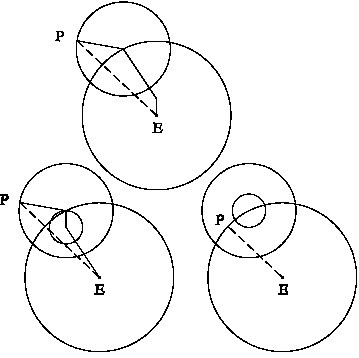 Если исходить из греческих моделей, то обоснование этих нетривиальных процедур уведет нас далеко от нашей темы, но вполне можно представить схематичное описание возникшей ситуации. Для начала возьмем простую греческую схему с одним эксцентрическим эпициклом (ил. 81, верхняя часть), она может быть преобразована в схему с двумя неконцентрическими эпициклами, где второй эпицикл будет носителем главного эпицикла (нижняя левая часть рисунка). (Для осуществления этого преобразования можно воспользоваться отношениями подобия, сформулированными Аполлонием; мы разбирали их в главе 4, используя в качестве иллюстрации ил. 52.) Радиусы эпициклов образуют некий угол с вершиной в центре (он не изображен на рисунке), служащий поправкой («аномалией» или «уравнением»), которую необходимо прибавить к долготе планеты, либо вычесть из нее. Два рассматриваемых эпицикла не являются концентрическими, но поскольку возникает задача по расчету указанных уточняющих углов, они могут быть сведены к концентрическим (нижняя правая часть рисунка) посредством дополнительных преобразований, вводимых для уточнения поправок. К сожалению, в силу ограничений, налагаемых объемом книги, мы не можем более подробно рассмотреть здесь соответствующие процедуры.