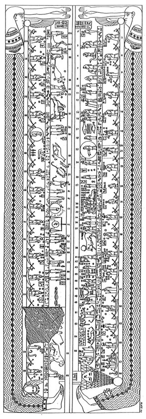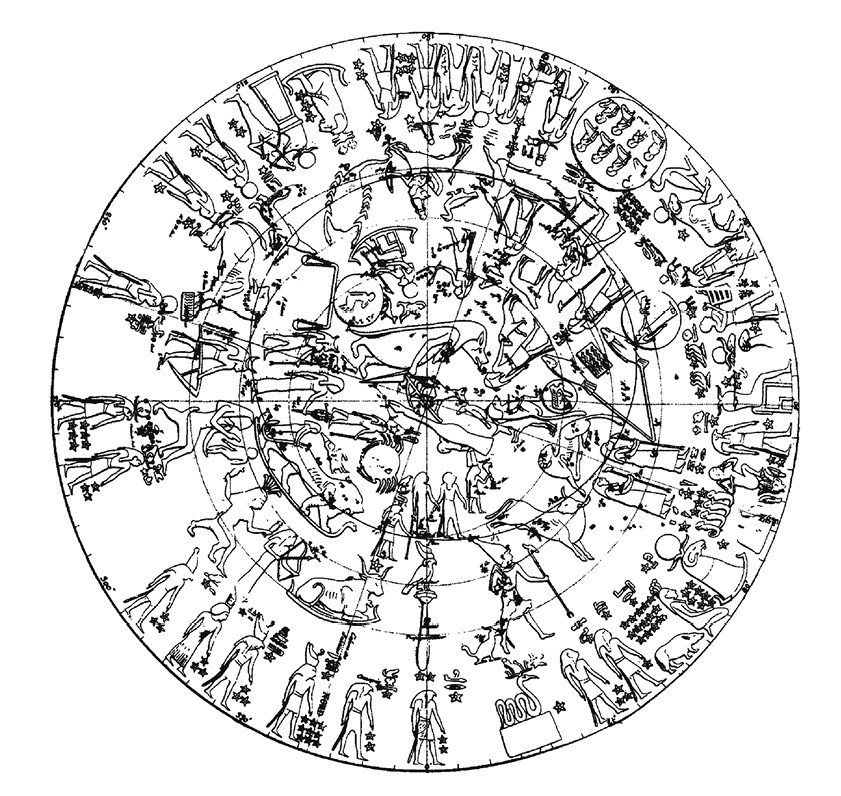 Схематический эскиз рельефного зодиака, хранящегося в настоящее время в Лувре. Представляет изображение потолка небольшой восточной молельни бога Осириса на крыше храма богини Хатор в Дендере. Приводится по рисунку, взятому из четвертого тома опубликованного отчета С. Л. Ф. Панкука об исследованиях, проведенных во время Египетской кампании Наполеона («Description de l’Egypte… l’expédition de l’armée Française», ок. 1820–1830). Рисунок содержит несколько мелких ошибок. В настоящее время в храме в Дендере имеется гипсовая реплика оригинала.