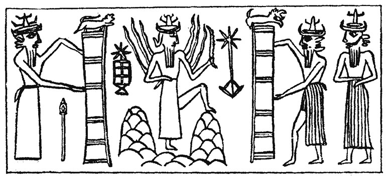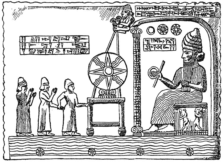 Еще в пятом тысячелетии до н. э. торговцы с берегов Тигра и Евфрата накладывали на глину оттиски для опечатывания дверей, сосудов и других емкостей. После XXXV в. до н. э. были в ходу искусно гравированные цилиндрические печати, которые прокатывали по глине, чтобы оставить на ней отпечаток. На рисунке изображен оттиск, оставленный печатью, относящейся к Аккадской династии (третье тысячелетие). Он содержит довольно распространенное изображение, связанное с эпосом о Гильгамеше (в настоящее время хранится в Британском музее). На рисунке бог Солнца Шамаш, которого можно узнать по исходящим от плеч лучам и пиле в руке, поднимается из седловины, образуемой двумя вершинами горы Машу.
