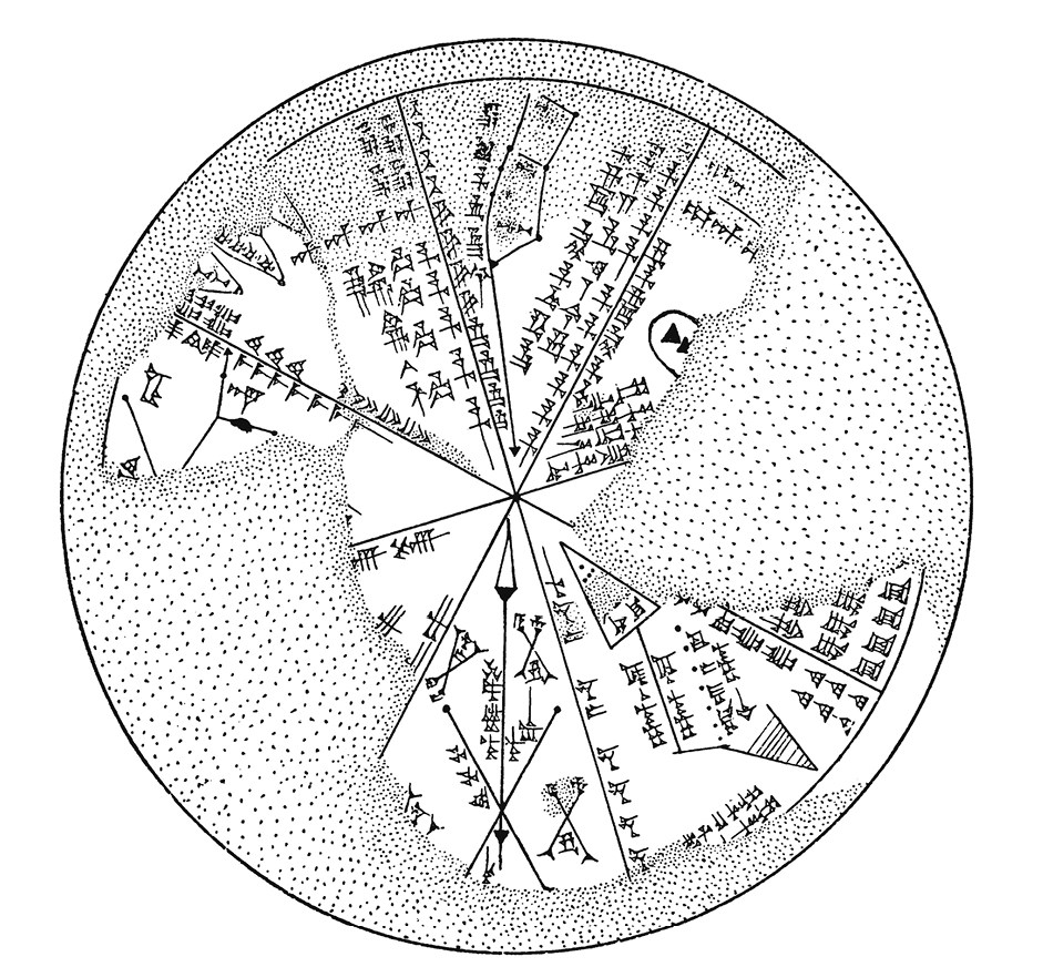 Рисованная копия фрагментов карты звездного неба из библиотеки в Ниневии, основателем которой считают Ашшурбанапала, последнего из великих ассирийских царей, правившего в 668–627 гг. до н. э. На этом глиняном диске приведены клинописные названия и схематические изображения звезд и созвездий (звезды соединены линиями, как на современных картах). Против часовой стрелки снизу: Сириус (Стрела), Пегас и Андромеда (Поле и Плуг), Овен, Плеяды, Близнецы, Гидра с Вороном и Девой, Весы. Следует отметить, что небо разделено на восемь частей. (Британский музей, табличка K 8538, скопировано Леонардом Кингом [1912], исправлено Иоганном Кохом [1989].)