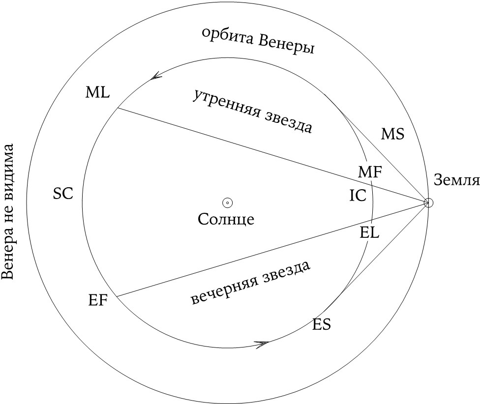 Приближаясь к верхнему соединению, помеченному на рисунке точкой SC, или нижнему соединению, IC, Венера становится невидимой, поскольку и в том и в другом случае ее затмят солнечные лучи. Чтобы стать доступной наблюдению, она должна находиться на расстоянии примерно 10° от Солнца. (Величина этого угла зависит от многих факторов, но у нас пока нет нужды вдаваться в эти подробности.) На рисунке точки MF и ML обозначают положения, когда Венера наблюдается первый и последний раз в виде утренней звезды; а EF и EL – точки ее первого и последнего появления в виде вечерней звезды.