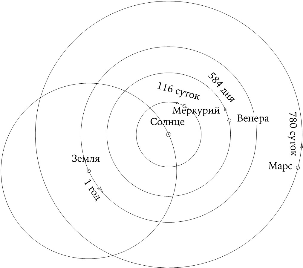 С чисто геометрической точки зрения Солнечную систему можно рассматривать и как гелиоцентрическую, и как геоцентрическую, хотя и не с такими принятыми в древности геометрическими допущениями. Земля, как и остальные планеты, обращается вокруг Солнца, мало чем отличаясь от них в этом смысле. (Для простоты здесь изображены только четыре орбиты, причем все они предполагаются круговыми.) Мы можем без ущерба для всей конфигурации связать неподвижный центр этой системы с Землей. Можно предположить далее, что Солнце обращается вокруг Земли (также в направлении, противоположном движению часовой стрелки, как это показано на рисунке), а все другие планеты следуют за ним, и в центрах их орбит расположено Солнце.