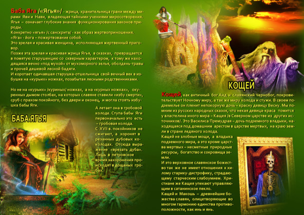 Баба «Ягья» или Яга – жрица, хранительница грани между мирами Яви и Нави, владеющая тайными учениями миросотворения. Ягья – означает глубокие знания функционирования законов природы.
