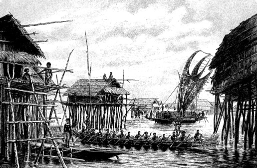 Деревня на сваях в Новой Гвинее. Гравюра. Ок. 1900 г.