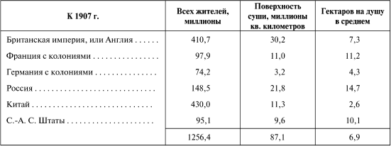 Эти данные (D, А, В и С) внесены в табл. 1, которая показывает по сравнению с целыми государственными владениями Англии и Франции, что Россия как по величине поверхности, так и по числу жителей занимает средину между двумя упомянутыми государствами, Германия же в обоих отношениях слабее каждого из них. Хотя в России на жителя (14,7 га) земли приходится в среднем гораздо более, чем в английских владениях (7,1 га) и даже французских (11,2 га), но не должно забывать, что в России около трети земли, находясь около Ледовитого океана, бесполезно в отношении к земледелию, составляющему преобладающий промысел России, а в тропических странах, где имеются колонии – а потому и запасы на будущее – не только у Англии и Франции, но и у Германии, у России нет никаких следов или даже попыток занятой земли. Зато у России есть такая сплошная непрерывность занятой ею суши, какой нет ни у одной из трех западноевропейских мировых держав.