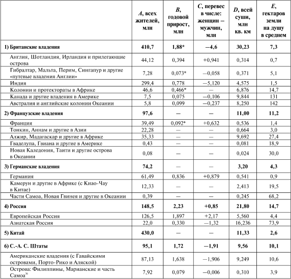 В отношении к числу всех жителей обыкновенно встречаются цифры значительно меньшие, чем здесь, но различные по разным источникам. Это зависит преимущественно от того, что чаще всего берут числа последних переписей, а они, во-первых, меньше современной действительности, потому что относятся к протекшим годам, во-вторых, переписи разных стран относятся к разным годам, часто друг с другом не совпадающим, приведенные же у нас числа по возможности точно исправлены и приведены к одному сроку – к 1 января 1907 г. (нов. ст.). Такое приведение, конечно, сопряжено с предположениями, касающимися принятых данных для годичного прироста. Там, где этот последний не известен, или где данное для числа жителей не отнесено к определенному сроку, приходилось поступать более или менее наугад, но при этом я старался не увеличивать чисел, а либо сохранять ранее известные цифры без поправок, либо поправлять лишь немного, с округлением. Для стран с малым количеством жителей все это имеет лишь малое влияние на окончательные выводы, но для Китая величина велика и надо оговориться. Долгое время число жителей Китайской империи определялось цифрами, близкими к 250–300 млн, хотя китайские сведения дали еще в 1844 г. население, без Монголии, Маньчжурии и проч., 413 млн.