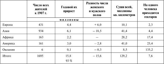 Такие громадные материки, как Африка, Америка и Австралия, поныне населены, сравнительно с Азией, очень слабо, а столетия за два, когда их мало знали и они были предоставлены своим силам и течениям жизни, число в них жителей, по всей вероятности, говоря вообще, было если не меньше, то уже никак не больше современного, хотя местами и были скопления, властвовавшие над всем соседним. Главною причиною малой населенности названных континентов, богатых дарами природы, служили, без сомнения, войны, везде господствовавшие, и ими вызванный деспотизм, по сравнению с которым европейский или азиатский деспотизм может быть назван благодетельным. Этим я не желаю обелить ни жадных испанцев, беспощадно истреблявших южноамериканские и другие народы, ни английских приемов истребления маори или североамериканских индейцев, ни истребления негров арабскими народами, а желаю только выяснить ту мысль, что роль европейцев в Африке, Америке и Австралии, несомненно, послужила к смягчению нравов и даже к увеличению числа жителей, если не во все время последних двух столетий, то, по крайней мере, за последние десятилетия XIX ст., и надо полагать, что так будет и впредь что должно послужить к быстрому росту числа жителей, особенно в Америке и Австралии, где при современной мере годового прироста (около 1,75 %) удваивание числа жителей должно совершаться примерно в 40 лет. А так как при годовом приросте в 6 млн на 934 млн, как в Азии, удваивание произойдет лишь в 120 лет, тогда лет чрез 150 Америка должна быть столь же тесно заселена, как и Азия. Для мальтусов тогда должны начаться гибель человечества и общие бедствия от недостатка продовольственных средств, но для современных мыслителей и наблюдателей– одним из каких стараюсь быть сам и каких желаю более всего видеть как в русской среде, так и всюду – увеличение числа жителей в Европе и Азии в 4 раза, а в Африке, Америке и Австралии раз в 10 или 12, т. е. население всей Земли 10 тыс. млн (10 млрд) людей: а) ничуть не страшно, б) обещает только хорошие результаты и в) не только возможно лет чрез 250–300, но и желательно, что я и постараюсь показать и доказать, хотя со всею возможною краткостью.