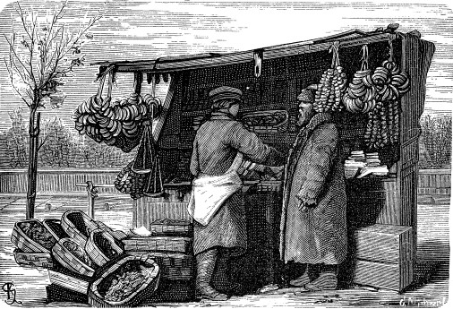 Между промышленниками одними из первых (исторически) возникли торговцы, тотчас после минования первичного патриархального быта. Русские торговали издревле, и торговые склонности в русском народе, несомненно, существуют, между прочим, вероятно, по той причине, что торговая деятельность обыкновенно сопряжена с малой внешней работой, хотя с немалым трудом расчетов, соображений и т. п. Однако русскую торговлю, даже в наше время, нельзя считать ни однообразно и широко развитою, ни образцовою в каких бы то ни было отношениях, как видно уже из того, что среди торговцев у нас много иностранцев, а «запрос» и торговые обманы встречаются еще в изобилии со стародавних времен, хотя и тут свои передовые люди понемножку заводятся уже и в московской среде.
